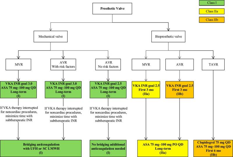 Anticoagulation for Prosthetic Valves Risk factors include AF, previous thromboembolism, LV dysfunction, hypercoagulable condition, and older-generation mechanical AVR. AF indicates atrial fibrillation; ASA, aspirin; AVR, aortic valve replacement; INR, international normalized ratio; LMWH, low-molecular-weight heparin; MVR, mitral valve replacement; PO, by mouth; QD, every day; SC, subcutaneous; TAVR, transcatheter aortic valve replacement; UFH, unfractionated heparin; and VKA, vitamin K antagonist.